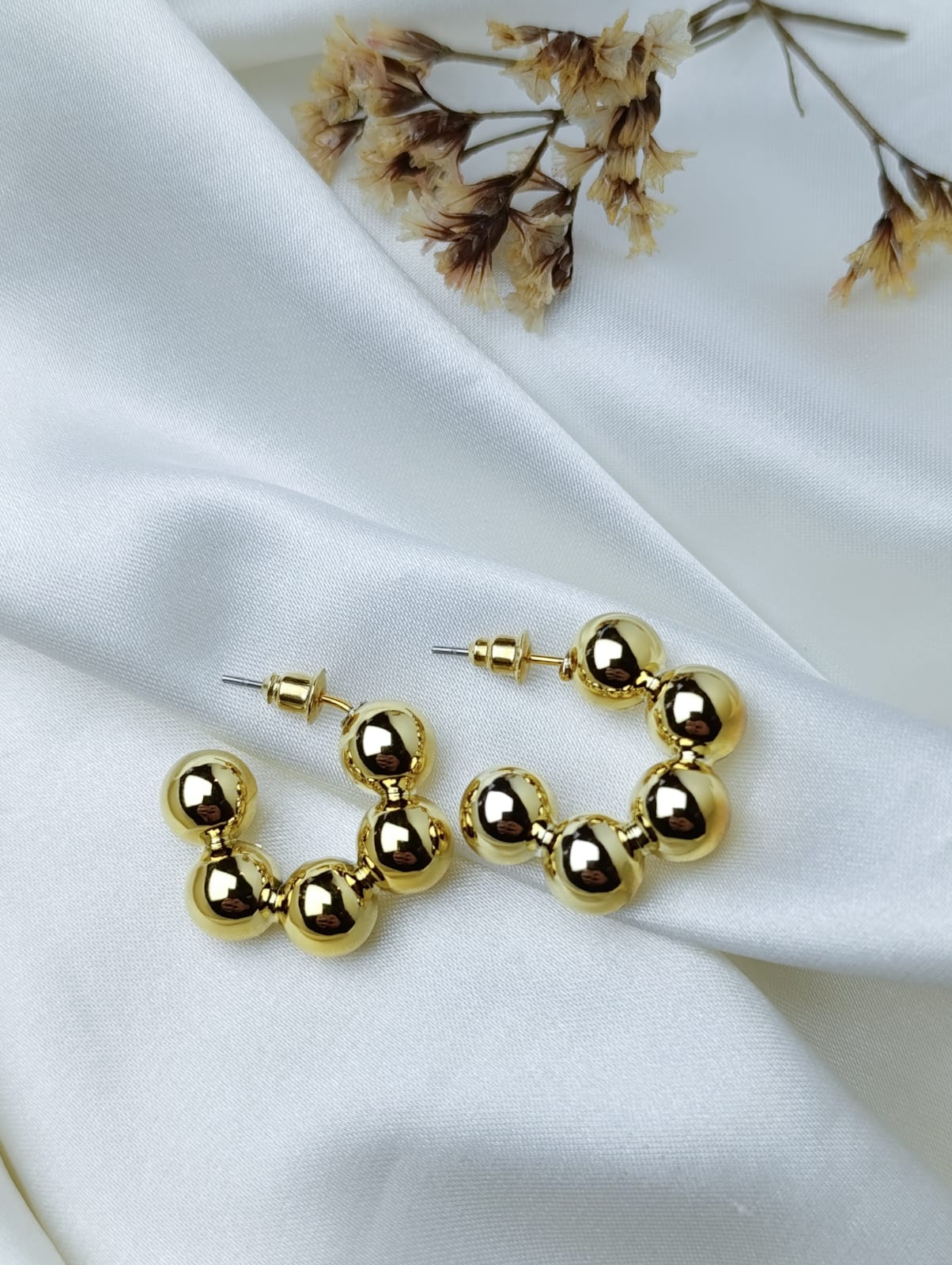 Diseño moderno y cómodo que eleva cualquier look. Estos aros están formados por esferas doradas enchapadas de brillo intenso, con pasante de acero quirúrgico que garantiza comodidad y durabilidad. Una pieza elegante, ideal para quienes aman los accesorios llamativos pero con un toque delicado.