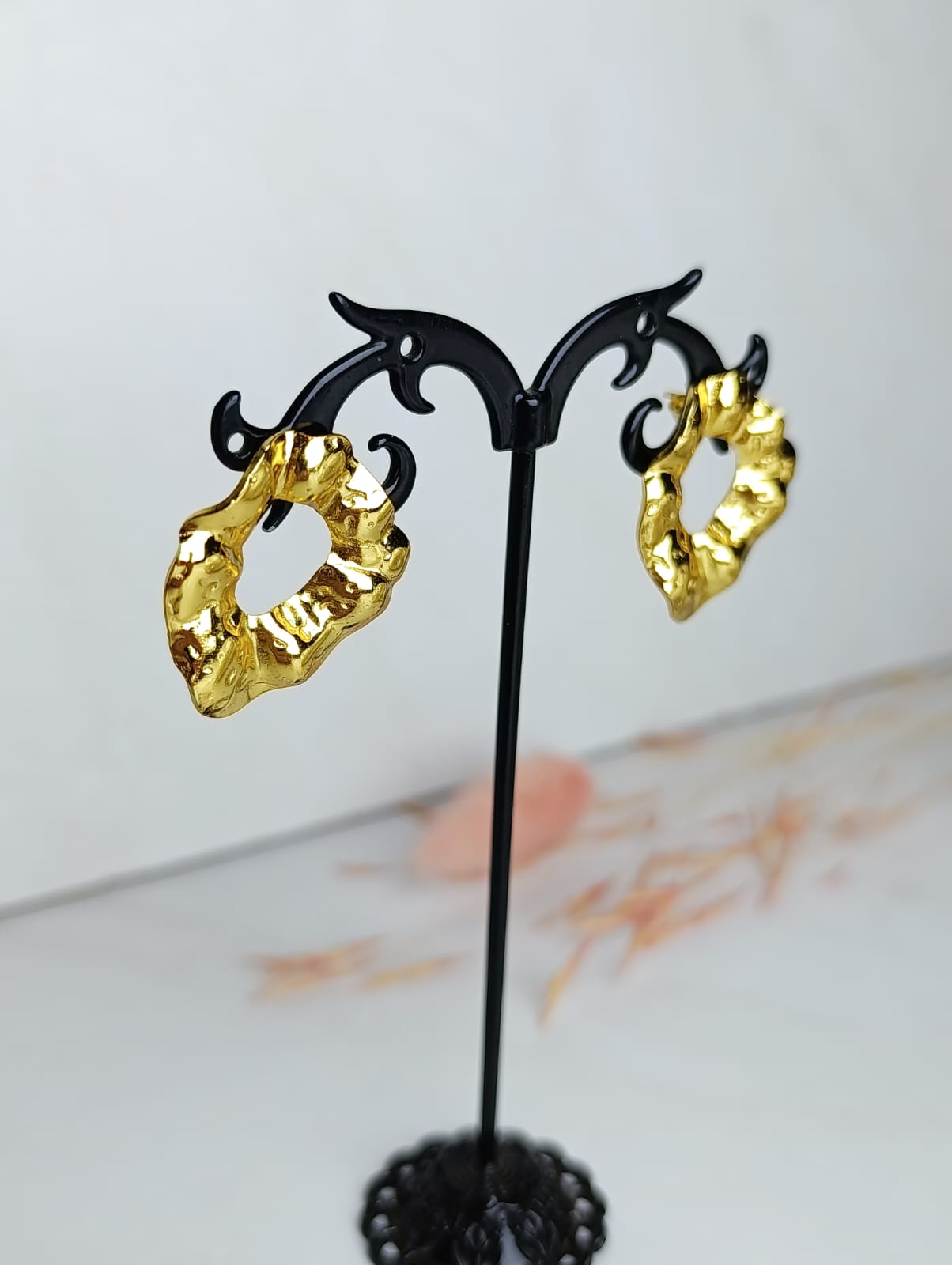 Aros tipo argolla con un diseño orgánico y textura irregular que les da un estilo moderno y llamativo. Su acabado dorado los convierte en un básico elegante para usar tanto de día como de noche.