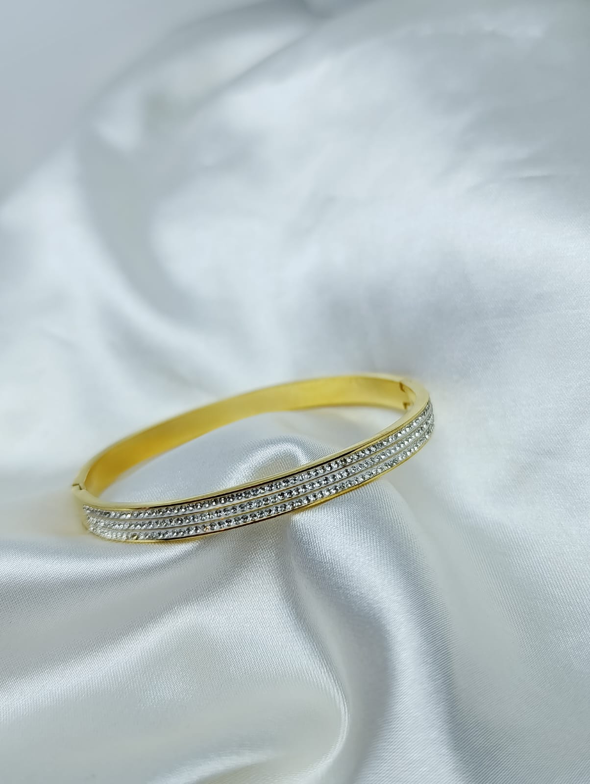 Pulsera tipo brazalete que combina el encanto del acero pulido con el toque radiante de piedras brillantes en la mitad del brazalete.