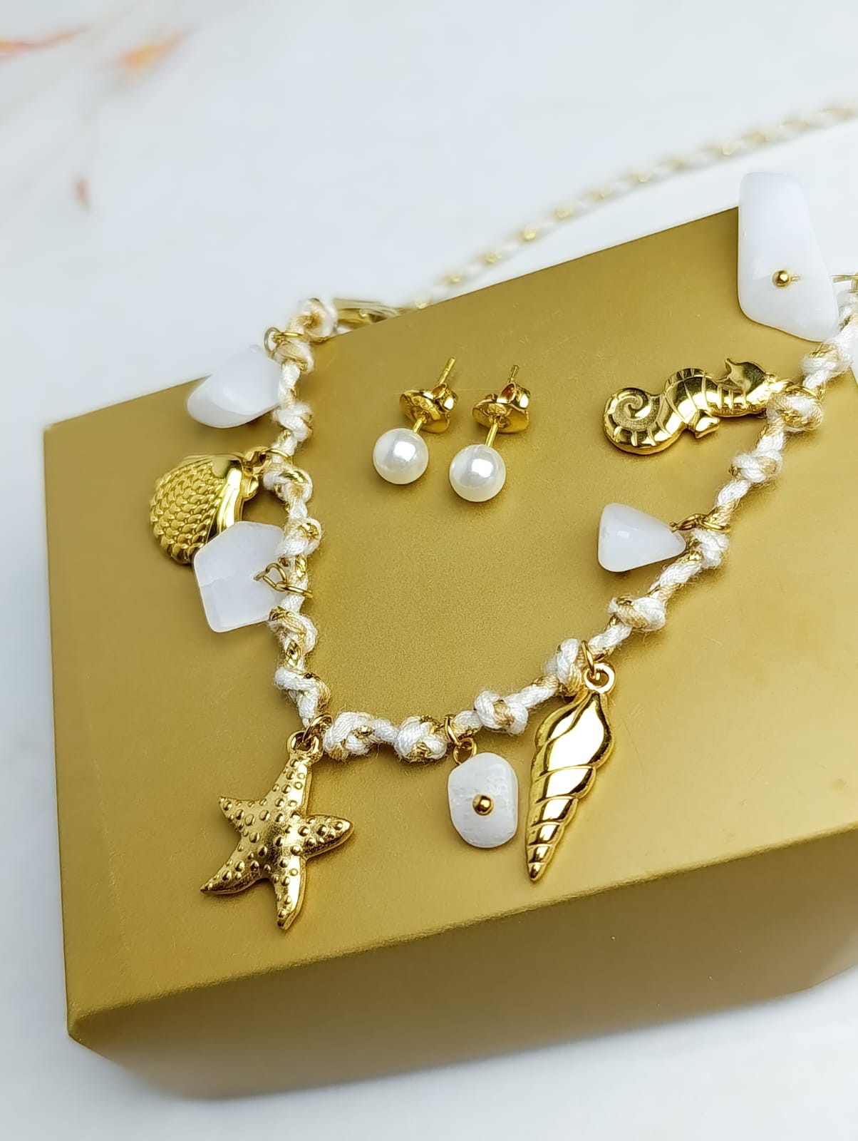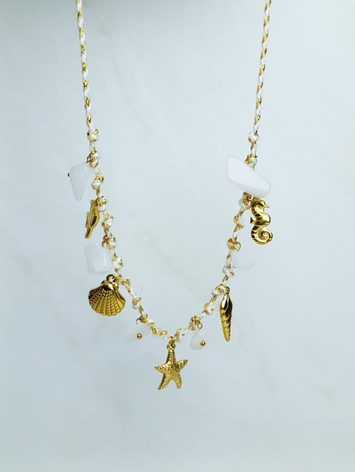 Un collar inspirado en el mar, con cadena trenzada en tonos claros y dijes dorados de caracol, estrella de mar, caballito de mar y conchitas. Incluye detalles de piedras blancas que aportan un toque fresco y natural. Ideal para un look veraniego, playero o para darle un toque diferente a tus outfits diarios.